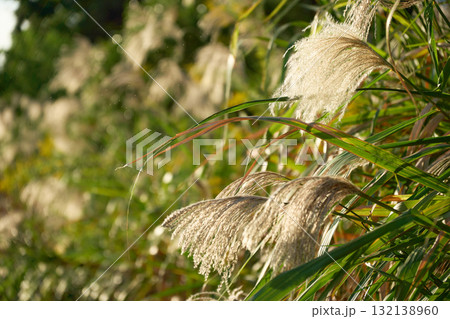 日差しを受けて輝くススキの穂。日本の秋らしい風景。