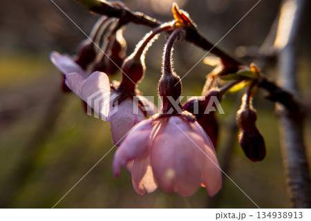 夕暮れ時の東京都立桜が丘公園に咲く桜の花の花弁と萼片、萼筒の写真