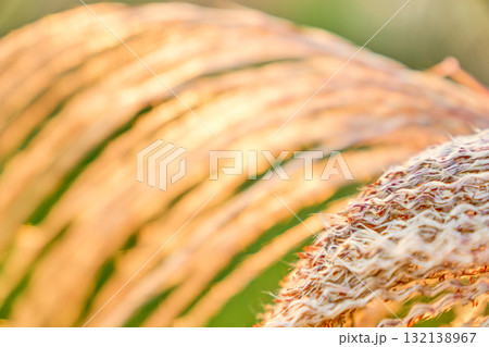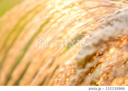 夕日を受けてオレンジ色に輝くススキの穂のクローズアップ。日本の秋らしい風景。手前のススキにピント