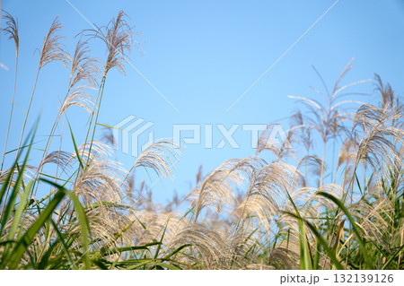 青空と風になびくススキの穂。日本の秋らしい風景。手前のススキにピント
