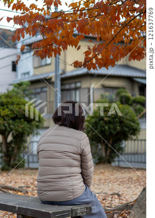 公園に座ってボーっとしている中高年女性の後ろ姿