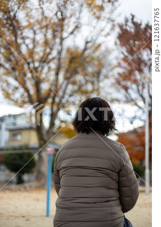 人のいない公園で一人ブランコに乗る中高年女性の後ろ姿