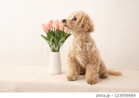 白バックとチューリップと微笑むマルプーのくーちゃん