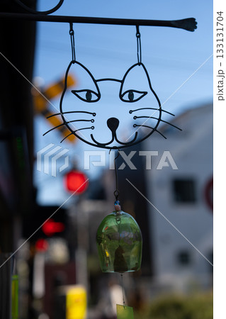 鎌倉の街角に揺れる猫のオブジェと風鈴