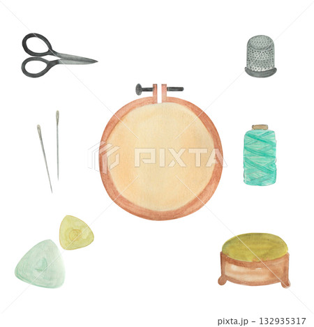 Watercolor illustration of a sew kit. Suitable for a studio or school, as well as for a designer. Embroidery