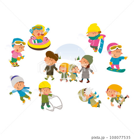 友だちと一緒にアイススケートを楽しんでいる可愛い小さな子供たちのイラスト セット 白背景