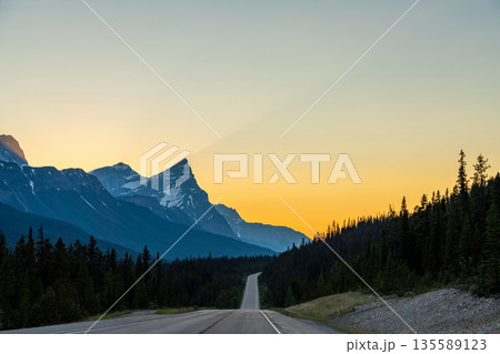 夕暮れ時に山に向かってアイスフィールド・パークウェイを走る車。アルバータ州、カナダ