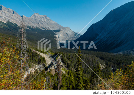 Jasper, Alberta, Canada. Icefields Parkway (Alberta Highway 93), Jasper National Park Scenic Drive. Canadian Rockies summer landscape in the background.