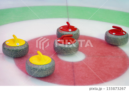 Curling granite stones on ice. Group of curling stones with red and yellow handles placed on center of target rings. Concept of curling tactics, competition scoring and precise stone placement