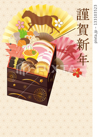 午年 馬年 年賀状テンプレート お節と和風アイテム