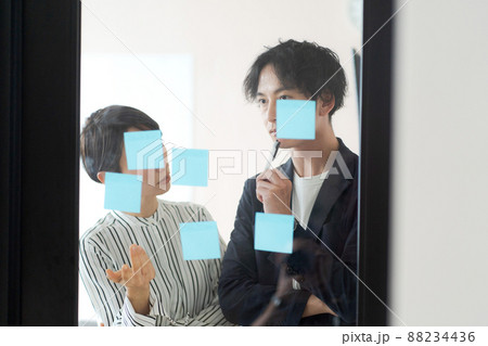 Businessman in black suit and colleague meeting with sticky paper notes on the glass wall for new ideas. Using agile methodology for business in a tech start-up office.