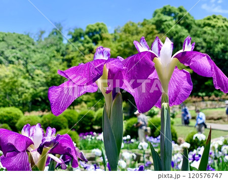 五月晴れの青空と新緑に囲まれ咲き乱れる花菖蒲〈東公園花菖蒲園/愛知県岡崎市〉
