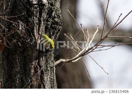 コナラの幹に止まるメジロ科メジロ