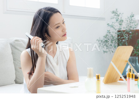 ヘアアイロンをかけるミドル女性