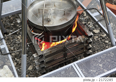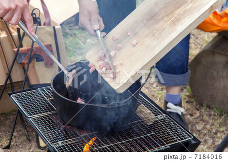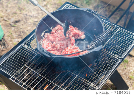 キャンプ場でフライパンで肉を焼くイメージ バーベキュー