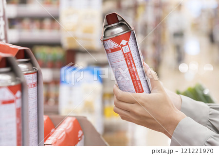 スーパーでカセットガスを買う女性手元