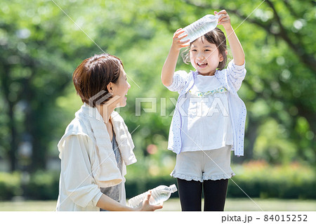 公園で水分補給をする小学生女の子