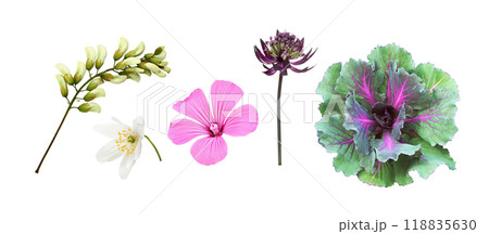 Set of different flowers and buds (acacia, wild anemone, astrantia, lavatera, ornamental kale) isolated