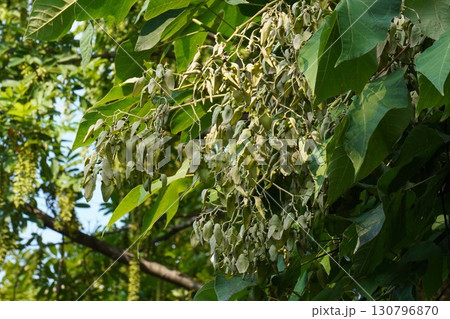 変わった形の実・桐に葉が似るというアオギリの果実・縦位置