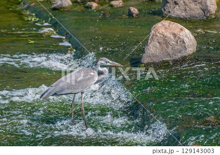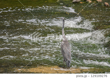 川の中で獲物を狙う1羽のアオサギ