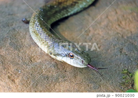 岩場を這って移動しながら舌を出すアオダイショウを正面から撮影