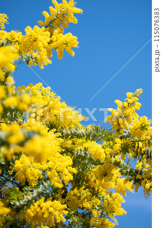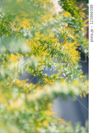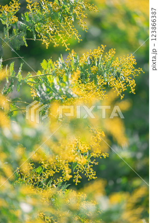 春の訪れを知らせる黄色いミモザの花のクローズアップ
