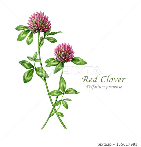 Red clover blooming plant watercolor illustration. Hand drawn trifolium pratense medicinal herb vintage style botanical image. Red clover meadow wildflower isolated on white background