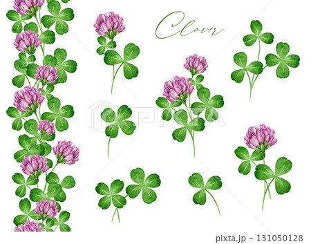 Red clover wildflower plant watercolor illustration set. Hand drawn Trifolium pratense herb flowers, leaves, seamless border elements on white background
