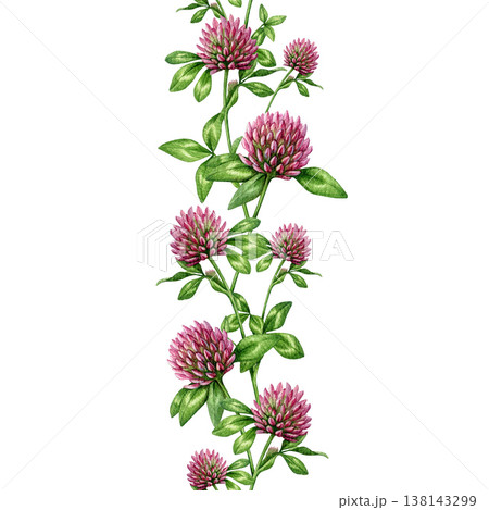 Red clover medicinal plant seamless border. Hand drawn Trifolium pratense herb watercolor illustration. Blooming clover with green leaves and flowers seamless border decor element