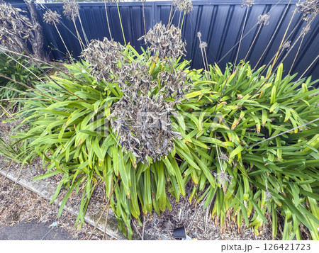 Dead flower heads on a vibrant green Agapanthus plant