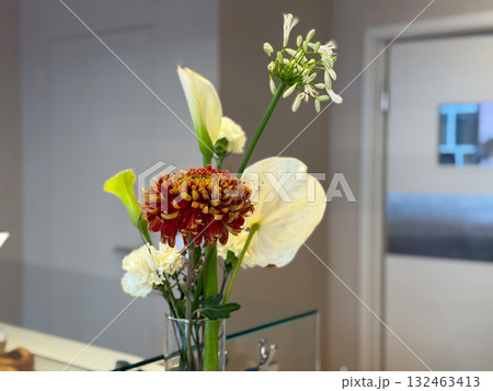 Flower bouquet in glass vase on neutral background. Natural beauty, interior harmony, and botanical elegance in everyday space.