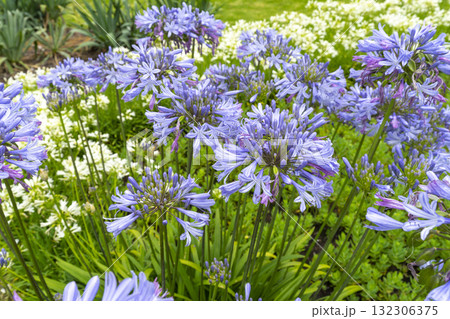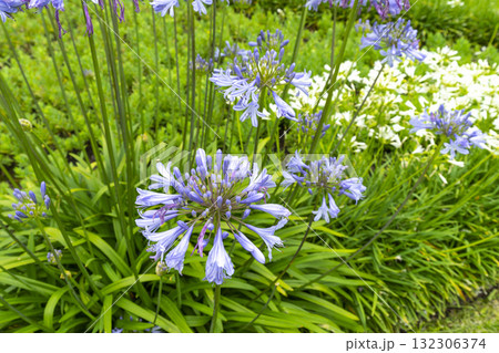 Blue agapanthus africanus flowers blooming in garden with soft background blur. Ornamental planting, seasonal flowering, ecological balance and calm outdoor atmosphere inspired by botanical beauty