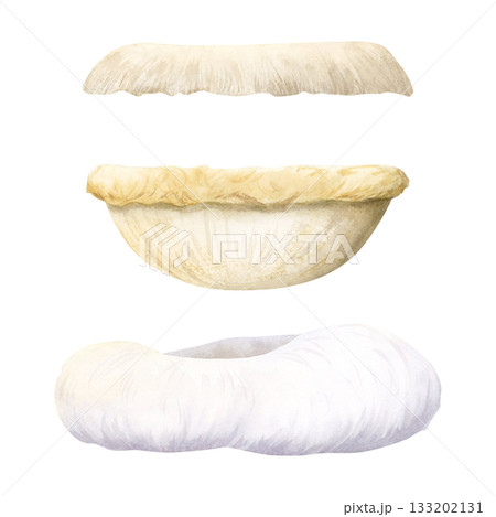 Cat beds watercolor illustration set isolated on white. Pet beddings in pastel beige colors for domestic animals. Fluffy and natural accessories and furniture clip art for pet shop designs