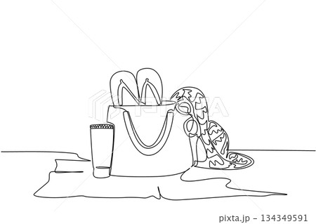 Single one line drawing tube of sunscreen, sunglasses, bag, woven hat and flip flops on the mat. Play equipment in summer. Protect. National Sunscreen Day. Continuous line design graphic illustration