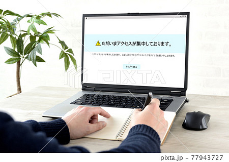 アクセス集中の画面が映し出されたパソコンと男性の手元