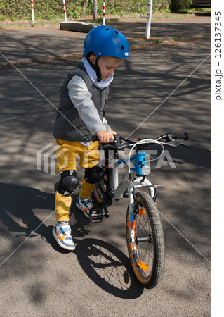 Child wearing safety gear learning to ride a bicycle in a park. Focused, determined expression while pushing bike along path. Bright helmet and knee pads for protection.