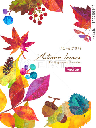 秋の紅葉した、自然素材のイラストセット。紅葉やどんぐりなどの木の実。カラフルなペインティングテクスチ