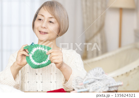 リビングで毛糸のアクリルたわしを編むシニア女性
