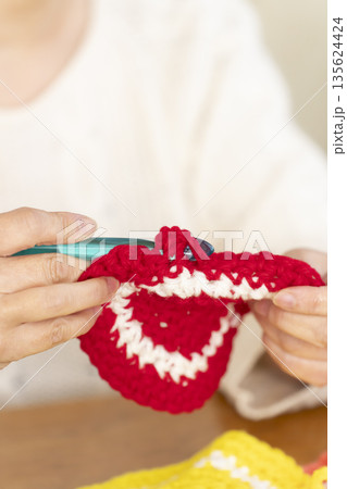 リビングで毛糸のアクリルたわしを編むシニア女性