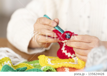 リビングで毛糸のアクリルたわしを編むシニア女性の手元アウトフォーカス