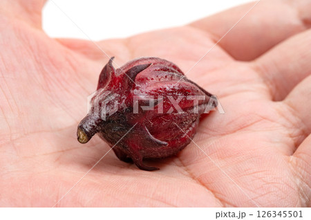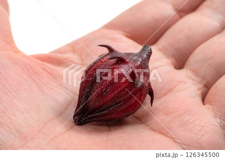 手のひらに乗せたハイビスカス・ティー用のローゼル