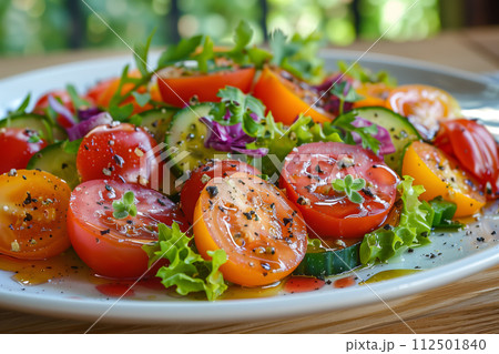 AI-generated content. Gourmet tomato and cucumber salad on plate