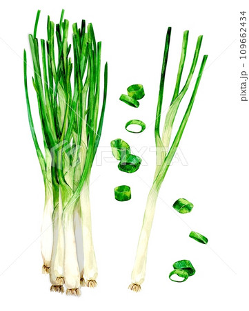 Watercolor drawing of a green onion, isolated on a white background. Botanical hand drawn illustration. Greens and chopped pieces. A set of aromatic kitchen herbs, spices for Mediterranean cuisine.