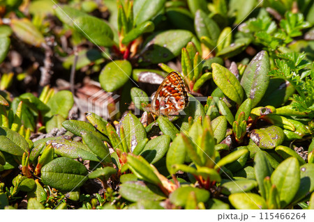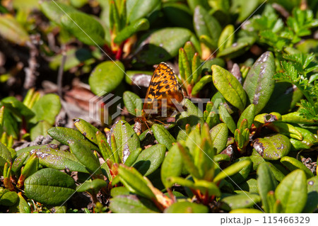 コケモモに産卵するアサヒヒョウモン(北海道・大雪山)