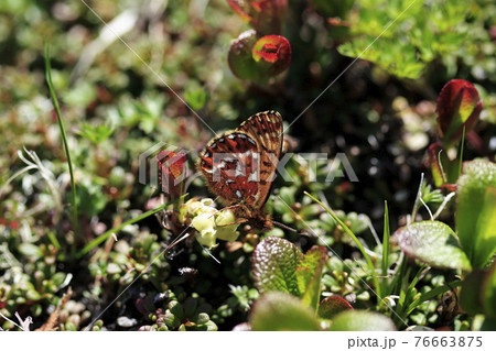 ウラシマツツジの吸蜜をするアサヒヒョウモン(北海道・大雪山)
