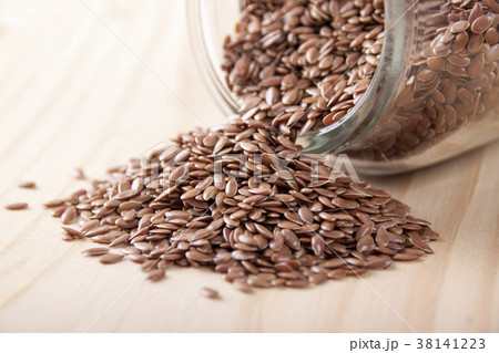 Brown flax seeds in wooden spoon, isolated on white background. Heap of dry flaxseed or linseed. Top view.
