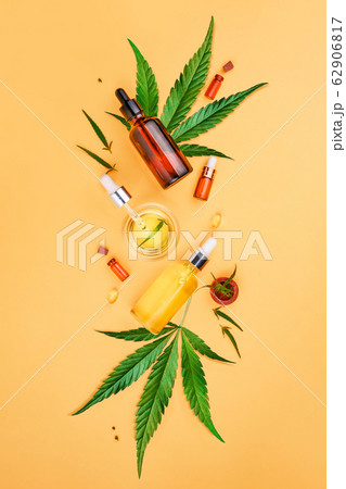 Glass bottles with CBD oil, THC tincture and hemp leaves on yellow background. minimalism. Cosmetics CBD hemp oil