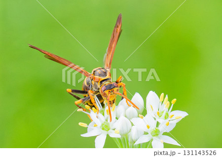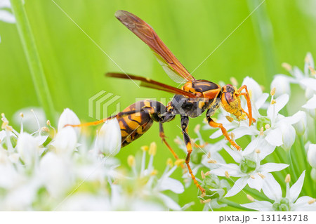 白いニラの花とキボシアシナガバチ(黄星脚長蜂)