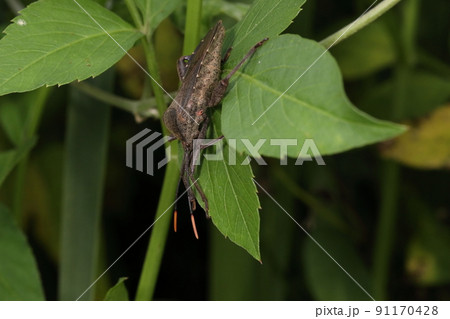 生き物 昆虫 アシブトヘリカメムシ、巨大な太腿のオス。大きさは三センチほどで割と赤っぽい色の個体②