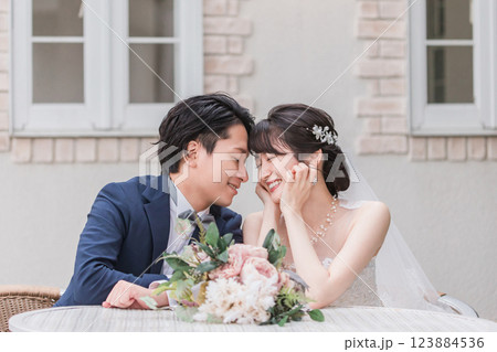 結婚式で結婚式場の庭でブーケと写真を撮る新郎新婦(ガーデンウェディング)